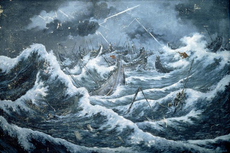 Puis le vent se leva. Alors que les navires étaient attachés les uns aux autres de l’île de Takashima jusqu’à la terre ferme vers Matsuura, un typhon gigantesque souleva l’océan. Les bateaux se frottèrent les uns contre les autres, les hommes furent emportés comme des fétus de paille, les navires proches des côtés se fracassèrent ou échouèrent sur les plages. Ceux qui étaient en mer coupèrent leur ancre pour tenter de fuir vers le large.