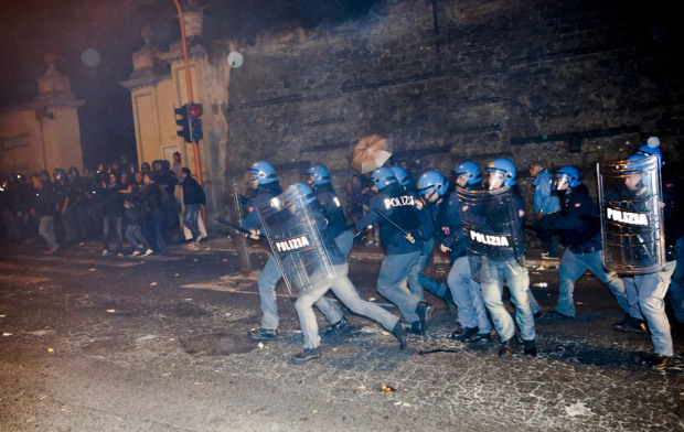 Des policiers en tenue anti-émeute en action,après que des émeutiers manifestaient ,en dehors de la Société de Saint-Pie X siège, un groupe catholique schismatique, où les funérailles de l’ancien officier SSi Erich Priebke qui devait avoir lieu dans Albano Laziale.