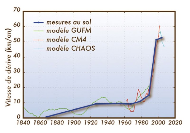Vitesse de dérive de la position du pôle nord magnétique depuis 1840, d’après les mesures sur le terrain (courbe bleue) et trois différents modèles géomagnétiques pour trois intervalles de temps différents.