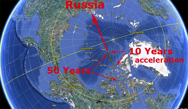À la direction du courant, le pôle nord magnétique se dirige directement vers la Russie. L’image suivante montre l’accélération spectaculaire tout en soulignant les 50 dernières années par rapport aux 10 dernières années du mouvement.