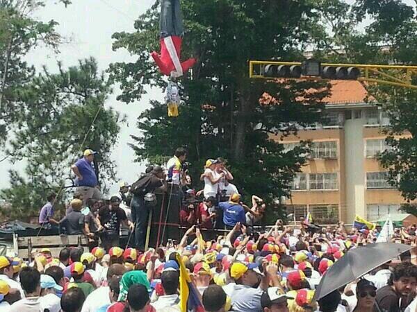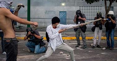 Dans un quartier huppé de Caracas, mises en scène destinées à l’opinion publique internationale. L’image de ces jeunes « guarimberos » d’extrême droite, alliée à l’occultation des marches pacifiques d’une majorité de vénézuéliens pour défendre leur vote, a produit une inversion du réel sur les petits écrans du monde entier.