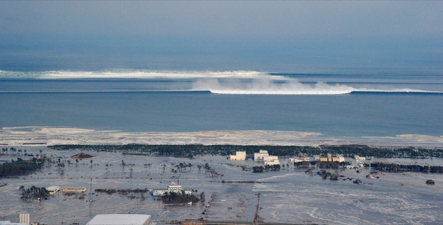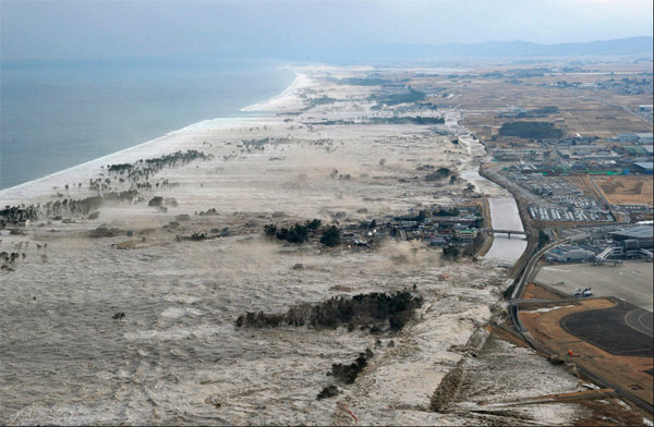 Le séisme de 9,8 au large du Japon provoque un gigantesque tsunami,le 11 mars 2011.Ici,on voit l’arrivée de la vague.