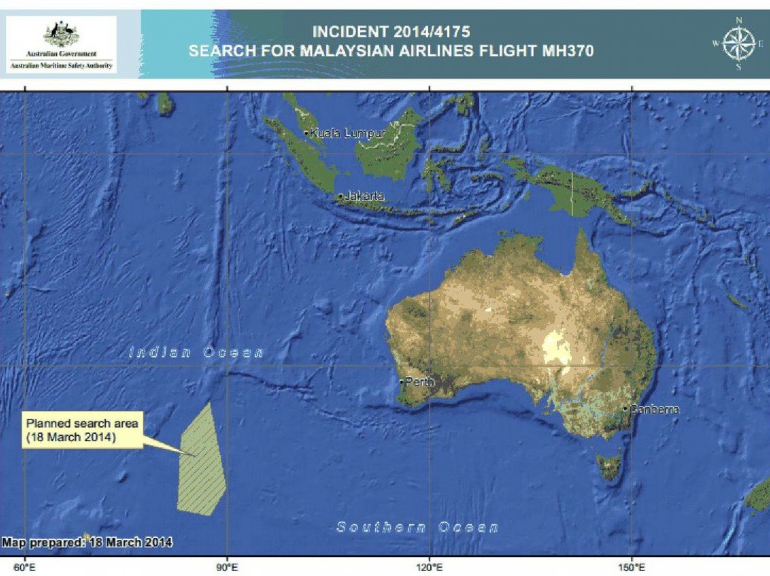 La zone sur laquelle l'armée australienne concentre ses efforts s'étale sur 600.000 kilomètres carrés, a-t-on annoncé le 18 mars. Il faudra des semaines pour la parcourir. En tout, les recherches vont du nord de la Thaïlande à l'Asie centrale pour le corridor nord (qui recouvre une partie de la Chine), et de l'Indonésie au sud de l'océan Indien pour le corridor sud. (AP Photo/The Australian Maritime Safety Authority)