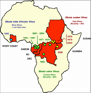 Les fièvres hémorragiques à Ebola sévissent dans des régions très localisées d’Afrique équatoriale, notamment en bordure des forêts. Le mode de transmission est à ce jour inconnu, et ce, depuis la toute première épidémie entre le 1er et le 5 septembre 1976, au Zaïre. 318 personnes contractèrent le virus et 280 en moururent. Le virus Ebola porte le nom d’une rivière près de la ville de Yambuku, (région de l’Équateur), où ce virus fut isolé lors de cette épidémie. Les vecteurs du virus Ebola sont pour l’instant inconnus. On ne connaît ni l’origine exacte, ni d’où ce virus pourrait provenir, mais on suspecte cependant un hôte animal (singe, rat, reptile, araignée, chauve-souris ?). Les études menées en suisse laissent penser qu’il pourrait s’agir de rongeurs.