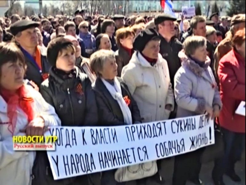 These are people in Lugansk on 30 April 20104. Their banner reads, « When the sons-of-bitches came to power, the people got a dog’s life! » The Uniate fascists dream that they will reunite « the Ukraine ». This picture proves otherwise. The Russian people of Novorossiya will die before submitting to backwoods Uniate thugs. Too much blood lies in the Novorossiyan earth… no decent Russian will ever want to live near Uniates ever again. I’m not a hater… I’m only writing what I’m seeing. It’s ugly… but do recall who STARTED the  mess. The Uniates are to blame… they’ve been crank ever since their apostasy in 1596. God do preserve us…