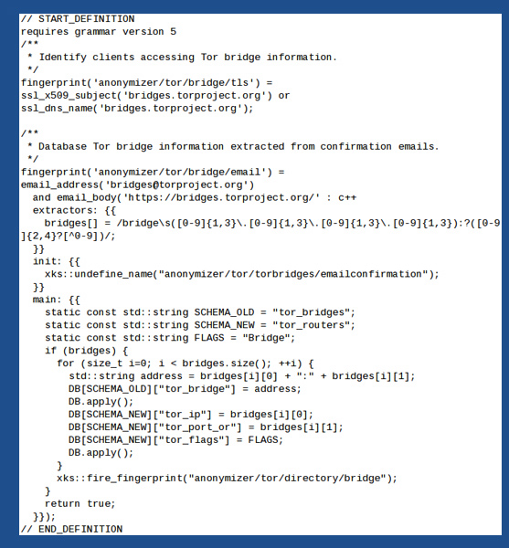 La NSA collecte même la liste des utilisateurs des « ponts » (ou « bridges« ) Tor, qui sont les noeuds privés créés par des volontaires qui acceptent de servir de relais lorsqu’un pays autoritaire bloque l’accès aux adresses IP des nodes privés. Pour connaître l’adresse d’un pont, un utilisateur qui subit la censure dans son pays doit faire une demande sur le web, ou envoyer un e-mail à l’adresse bridges@torproject.org. Avec XKeyScore, la NSA intercepte les e-mails envoyés ou reçus à cette adresse, extrait l’adresse IP des ponts, et les enregistre dans une base.