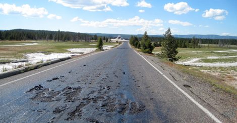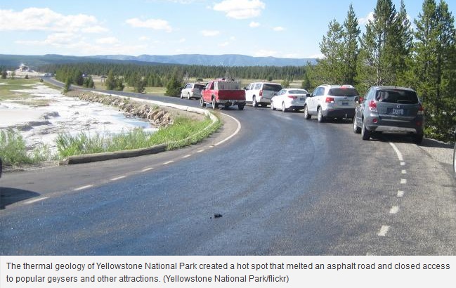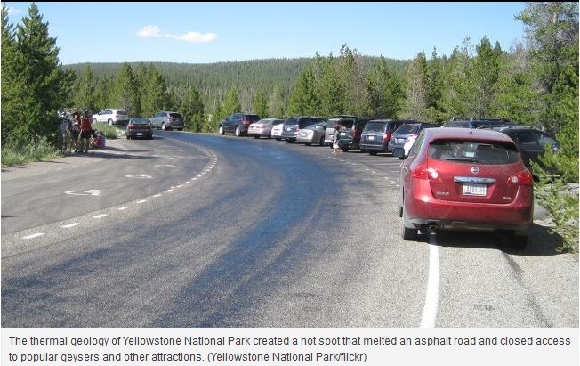« Naturellement »,disent les responsables, les changements dans les caractéristiques thermiques actuelles vont endommager souvent les routes et les trottoirs de Yellowstone. La cuisson à la vapeur dans les nids de poule des routes asphaltées et des parkings – délimité par des cônes de circulation – sont des curiosités assez communes.