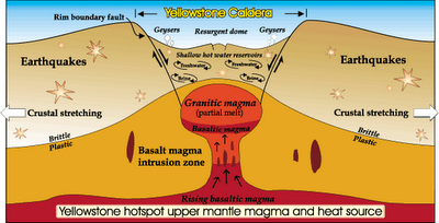 In Yellowstone, some 400 miles below the surface of the Earth is a « hot spot » of magma that rises to 30 miles underground before spreading over an area of 300 miles through the geological layers.