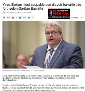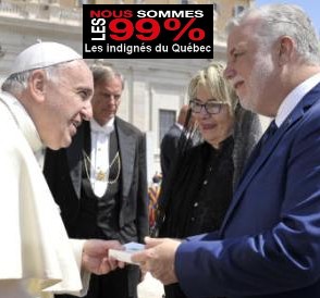 Depuis le 7 avril dernier le gouvernement autoritaire de Philippe Couillard continue d’étouffer le peuple Québécois en mettant de l’avant un programme d’austérité comme jamais le Québec n’en a connu auparavant. Élu avec à peine 24% du vote francophone, le parti libéral a quand même récolté la majorité à l’Assemblée Nationale (63%) avec 70 sièges. Cette incongruité. de notre système électoral permet à ces neolibéraux de sabrer dans les acquis sociaux créant ainsi une source de frustration et de mécontentement dans la population. Depuis l’élection de ces gueux, les Indignés du Québec ont publié de nombreuses illustrations sur ce gouvernement intransigeant qui sabre dans tous les domaines de la sphère publique (mais pas dans ses poches, ni dans celles de ses amis). En voici une brève sélection à diffuser sans modération.