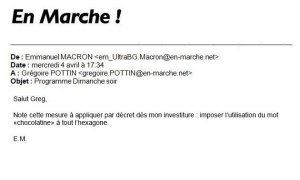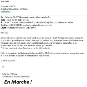 Le directeur des affaires générales de Macron et d »En Marche » , Grégoire Botton, écrit, sans ambages, « Je baise le peuple » et « je me masturbe au bruit de l’évier qui coule ». N’est-elle pas belle la démocratie française ?