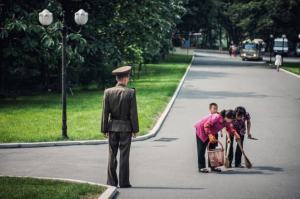 Cette armée est omniprésente dans le pays, et par des témoignages nous savons à quelles exactions elle se livre sur la population. Impossible d’obtenir des photos de ces militaires, sauf lors des défilés militaires officiels. L’armée est partout et surveille tout. Vous remarquerez que des femmes nettoient la route, car les habitants sont obligés de nettoyer les rues qui doivent toujours être impeccables.