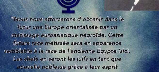 L’homme du futur sera le produit de différentes races. Les races et classes d’aujourd’hui disparaîtront progressivement par l’élimination des espaces, du temps et des préjugés. La race eurasienne-négroïde du futur, similaire en apparence aux anciens égyptiens, remplacera la diversité des peuples et celle des individus.Plutôt que de détruire le judaïsme européen, l’Europe, contre sa volonté, éduque ce peuple et le conduit à son futur statut de leader de ce processus artificiel. Ce n’est pas surprenant que le peuple qui s’est échappé des ghettos-prisons devienne la noblesse spirituelle de l’Europe.Ainsi cette attention particulière de l’Europe a donné naissance à une nouvelle race d’aristocrates. Cela est dû à l’anéantissement de l’aristocratie féodale européenne qui s’est effondré au moment de l’émancipation des juifs [En raison de la révolution française].