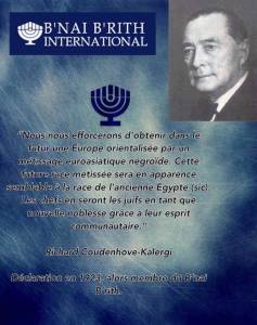 Kalergi proclame l’abolition du droit à l’autodétermination et ensuite l’élimination des nations grâce à l’utilisation de mouvements séparatistes et des migrations de masse; pour que l’Europe puisse être contrôlée par une élite, il veut transformer le peuple en un mélange homogène de métisses blancs, noirs et asiatiques. Quelle donc est cette élite? Kalergi nous éclaire particulièrement sur ce point: