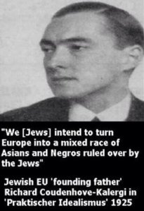 Dans son livre “Praktischer Idealismus”, Kalergi indique que les résidents des futurs “Etats-Unis d’Europe” ne seraient plus les peuples du Vieux Continent, mais une sorte de sous-hommes, issus du métissage. il expose clairement que les peuples d’Europe doivent se mélanger avec les asiatiques et les races colorées, créant ainsi un troupeau mltinational, sans qualités et facilement contrôlable par l’élite dominante.