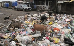 Des poules, des chèvres et des chiens ramassent des tas d’ordures. Des bouteilles en plastique vides flottent sur la marée du lagon de Lagos.