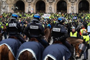 PARIS, FRANCE – 15 DECEMBRE 2018 devant la place de l’Opéra: les Gilets Jaunes face aux CRS.