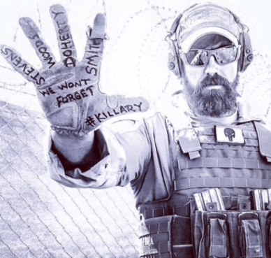 Un membre des forces spéciales américaines, avec le logo « Punisher » (en référence au film éponyme) régulièrement utilisé par Qanon, montrant dans sa main le nom des 4 américains assassinés à Benghazi (dont l’ambassadeur Stevens), avec la mention « nous n’oublierons pas », et le surnom d’Hillary Clinton : « Killary » (Hillary la tueuse, allusion à sa responsabilité dans le fait d’avoir laissé se commettre l’attaque).