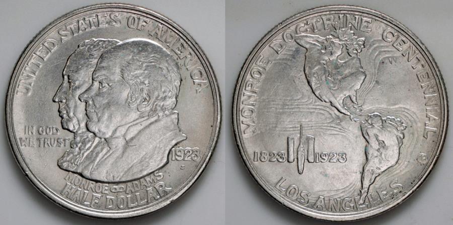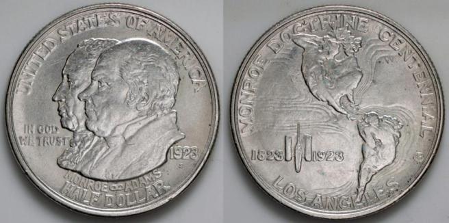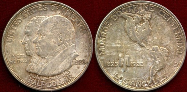 En 1922, l’industrie cinématographique a été confrontée à un certain nombre de scandales, les dirigeants de films ont cherché des moyens de faire une bonne publicité pour Hollywood. L’un des moyens était une exposition, qui se tiendrait à Los Angeles au milieu de 1923. Pour inciter le Congrès à émettre une pièce commémorative comme collecte de fonds pour la foire, les organisateurs ont associé l’exposition au 100e anniversaire de la doctrine Monroe, et une loi pour un demi-dollar commémoratif pour le centenaire a été adoptée.