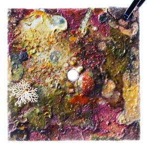 Photo 1- Récif sain: Les débuts colorés d’une nouvelle pousse de récif sur un carreau de céramique qui a été placé près de corail en bonne santé en Papouasie-Nouvelle-Guinée. Les nouveaux coraux sur le carreau donnent un aperçu de la barrière de la prochaine génération.