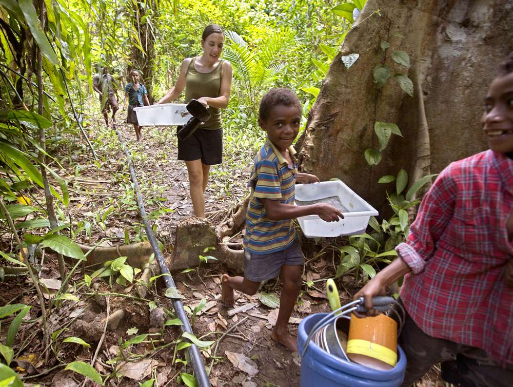 Les enfants aident biologiste Joy Smith baignoires panier en plastique de coraux et de sédiments à travers la jungle sur l’île Normanby, Papouasie-Nouvelle-Guinée. Elle cherche à savoir si le CO 2 pourrait nuire aux animaux minuscules au bas de la chaîne alimentaire marine.