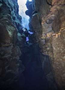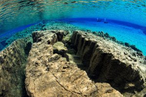 Fissure de Silfra En Islande, se trouve un spot de plongée où il est possible de nager entre deux continents. la fissure marque en effet la séparation entre les plaques tectoniques d’Amérique du nord et d’Eurasie.