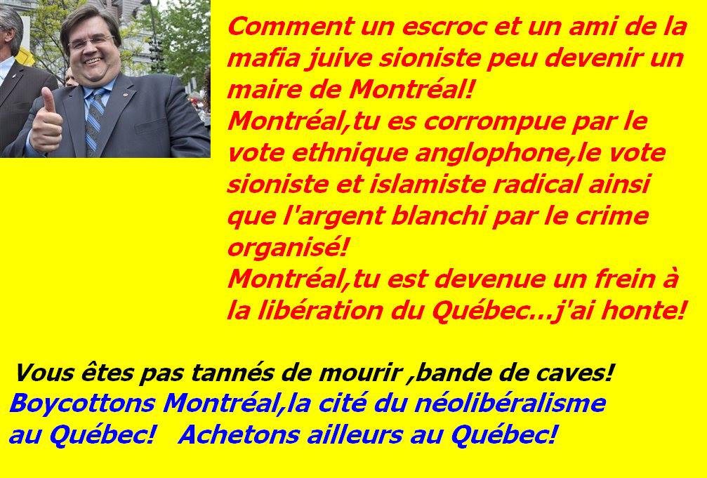 La photo de Denis Coderre victorieux sera parfaitement représentative de notre époque corrompue,de notre peur de prendre les moyens pour régler les problèmes auxquels nous faisons face .Dans 100 ans nos petits-enfants pourront lire en anglais,et tout comprendre en deux lignes,pourquoi nous serons devenus un peuple assimilé,resté colonisé dans l’âme et dépourvue de colonne vertébrale.