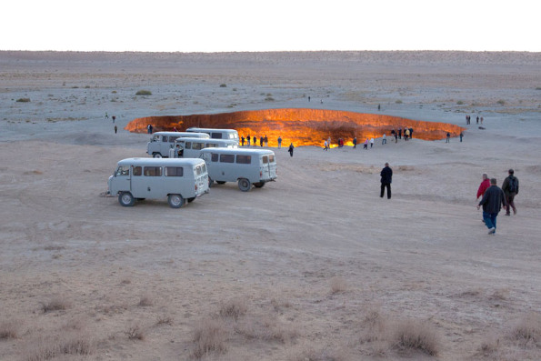 Quand les scientifiquessoviétiquesont découvert des réserves de pétroleprès de la villedeDerwezedans le désert duKarakoum, le forage a débutérapidement. Quandun appareil de forages’est effondré eta créé uncratère,de grandes quantités deméthaneont été libérés.Quandles pétroliersont tenté debrûlerleméthane, ceci a commencé un feu qui brûletoujoursplus de quaranteans plus tard.