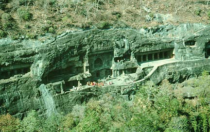 Les basaltes du Deccan ont peut-être joué un rôle dans l’extinction des dinosaures. La plupart du basalte a éclaté il y a entre 65 et 60 millions d’années. Les gaz dégagés par l’éruption ont peut-être changé le climat mondial et conduit à la disparition des dinosaures il y a 65 millions d’années. Cette photo montre les bâches du Deccan entre Mambai et Mahabaleshwar. Photographie par Lazlo Keszthelyi 27 Janvier 1996.Les vocanologistes tentent également de comprendre comment ces grands volumes de lave ont éclaté. Les premiers modèles ont proposé que la lave inonda sur de vastes superficies à des vitesses extrêmement rapides. Les modèles proposés ont récemment suggéré qu’au moins une partie des flux sont mis en place à des taux progressifs, durable de plusieurs mois à plusieurs années. Cette photo montre les Caves Ajunta, des temples creusés dans les basaltes. Remarquez le groupe scolaire pour l’échelle. Photographie par Lazlo Keszthelyi 31 Janvier 1996.
