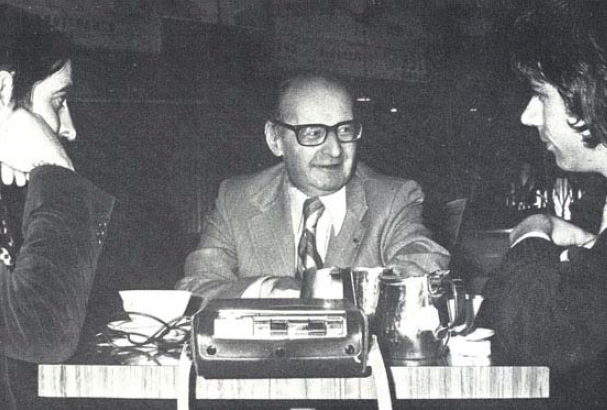 C’était en 1973(voir la photo ci-dessous). Attablés dans un snack des Champs-Elysées, nous écoutions Jacques Bergier. Nous avions retrouvé le même personnage décrit affectueusement par Louis Pauwels. Même accent rocailleux, même gentillesse, même regard pétillant d’intelligence. Il avait fait à KADATH un accueil aussi chaleureux qu’inattendu : un homme si occupé, tellement sollicité de partout, allait-il se donner la peine de nous envoyer des encouragements ? Oui, par retour du courrier, il nous disait tout le bien qu’il pensait de notre action, et nous invitait à son bureau. Nous avions beaucoup de questions à poser à Jacques Bergier. Il avait fait, quelques mois auparavant, une intervention très remarquée dans un débat à l’ORTF. Connaissant la différence de méthode qui l’éloigne d’un Robert Charroux ou d’un Erich von Däniken, nous avions entrevu un début d’explication, et nous ne pouvions qu’applaudir. Mais il allait nous en apprendre plus. Car cet homme, lorsqu’il se manifeste en public, a une attitude de prime abord paradoxale. Et c’est souvent à cet aspect que s’arrête le lecteur ou le téléspectateur moyen. Comme pour Salvador Cali, on ne comprend pas et on préfère sourire. Et pourtant…