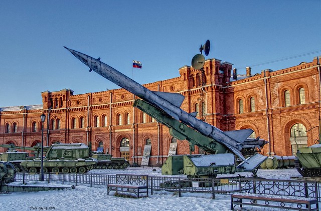 Un missile sol-air S-75 Dvina (SAM) en face du Musée historique et militaire d’artillerie, du génie et du Corps des transmissions à Saint-Pétersbourg, en Russie.