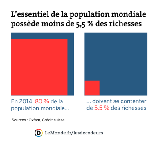 Selon l’ONG, « la part du patrimoine mondial détenu par les 1 % les plus riches était passée de 44 % en 2009 à 48 % en 2014, et dépasserait les 50 % en 2016 ». En d’autres termes, cela signifie que s’ils continuent à s’enrichir, les 1% d’ultra riches posséderont plus que l’ensemble des autres habitants de la planète réunis. La quasi-totalité des 52 % de patrimoine restant sont aux mains des 20 % les plus riches. « Au final, 80 % de la population mondiale doit se contenter de seulement 5,5 % des richesses », estime le rapport.