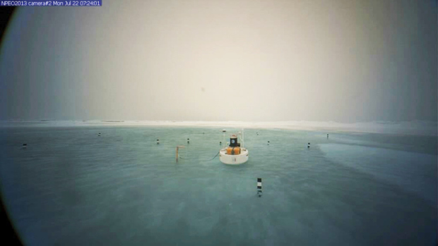 Pendant ce temps,à l’autre bout du globe,au lieude la neige etde la glacetourbillonnantdans le vent que nous pouvions apercevoir,il y a seulement un an , un lac de neige fondante (au Québec,on appelle cela de la sloche),de un à deux pieds de profondeurclapotemaintenantautour d’unewebcamen poste aupôle Nord.Le lacd’eau de fonte a commencé à se former le 13 Juillet 2013 ,après deux semaines detemps chauddans le haut Arctique. Au début de Juillet, les températures étaient de 2 à 5degrésFahrenheitsupérieur à la moyennesur la majeure partiede l’océan Arctique, selon le Snow &Ice (Centre national de données). Les étangsd’eau de fontegermentplusfacilement ,depuis quelques années ,recouvrant la glace mince,qui représente désormaisplus dela moitié de labanquisede l’Arctique. Les étangs d’eau de fonte s’échappent surla surface lisse dela glace artique ,favorisant la création d’un réseau qui emprisonne la chaleurdu soleil.