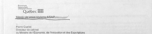 Voici l’échange de courriels survenu le 26 novembre 2014 entre le vice-président principal d’Investissement Québec et Pierre Ouellet, alors chef de cabinet du ministre Daoust :
