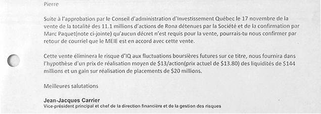 Un échange de courriels entre le directeur du cabinet de l’ancien ministre de l’Économie dévoilé jeudi confirme cette fois qu’Investissement Québec a demandé la permission et l’autorisation au ministère avant la vente de ses actions de Rona.