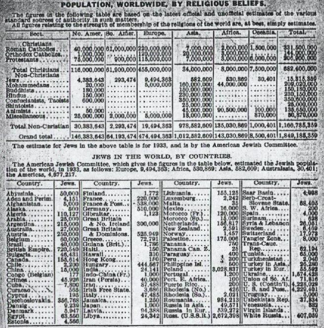 Depuis plus d’un siècle, l’Almanach juif mondial est largement considéré comme la source la plus authentique des chiffres de la population juive dans le monde. Les universitaires du monde entier, y compris les éditeurs de l’Encyclopedia Britannica, se fiaient à l’exactitude de ces chiffres. Voici ce que les Alamanacs du monde de 1933 et 1948 avaient à dire sur la population mondiale des Juifs.