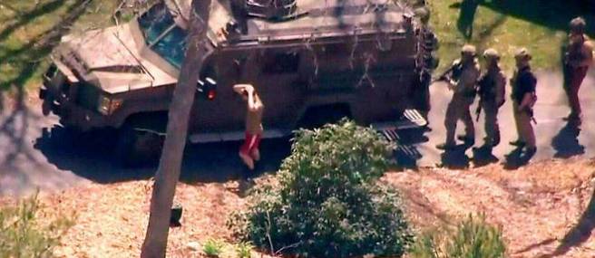 Les télévisions américaines ont diffusé en boucle des images aériennes montrant l’arrestation d’un individu par des agents des forces de sécurité. On pouvait y voir un homme, mains sur la tête et portant un t-shirt gris et un short rouge, reculer lentement vers des soldats avant d’être interpellé, puis escorté vers un véhicule d’allure civile.