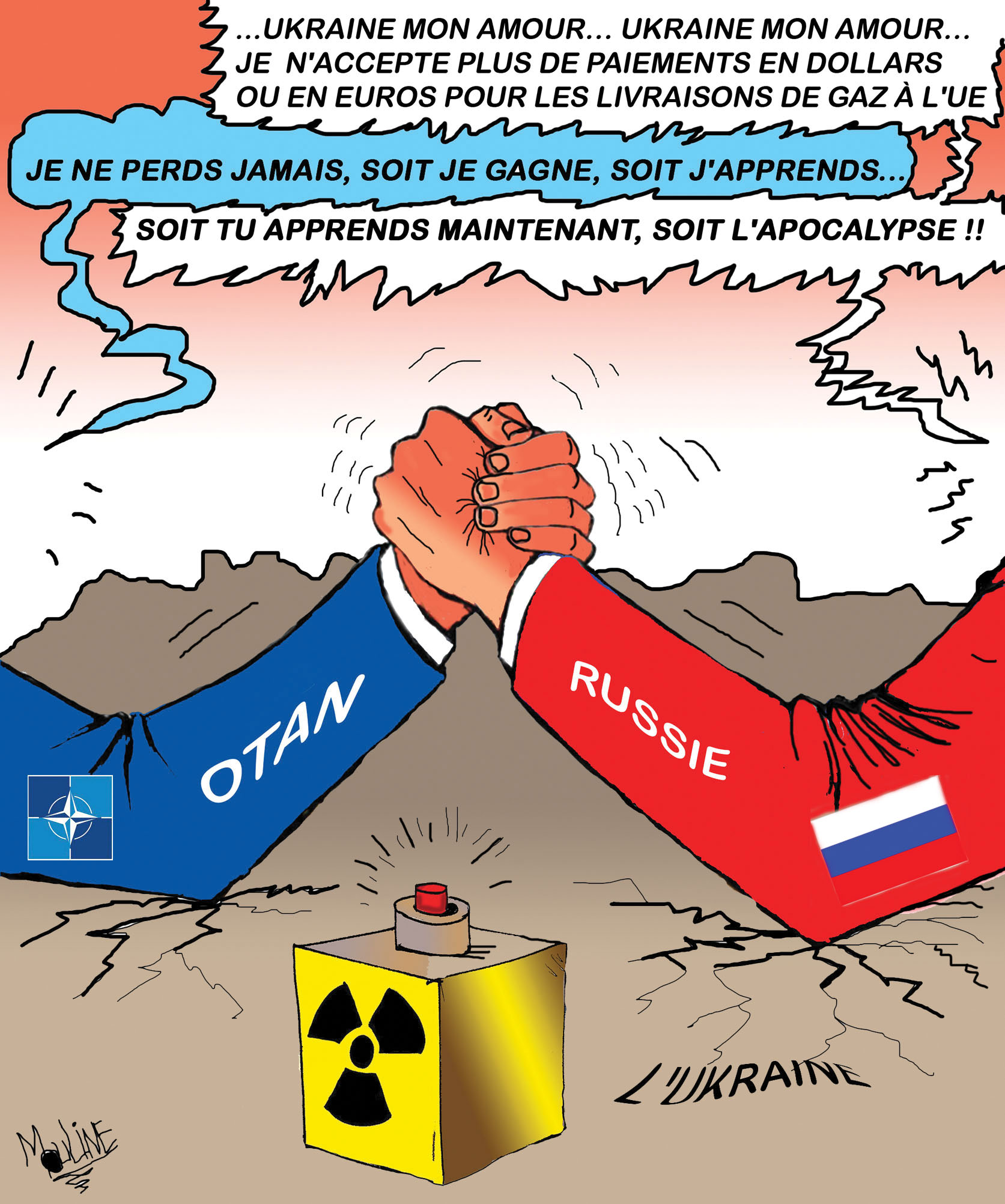 L’imminence de la partie brûlante et irréversible de ce clash exige de commencer à parler en très clair et en très gros de qui fait quoi , et qui sont les assassins ! La pub ou le mensonge quotidien doivent être démontés et dénoncés au mot à mot et au même quotidien ! Alors commençons par QUI EST LE PETIT GROUPE DES FANATIQUES TOTALITAIRES QUI RECHERCHE ” PAR TOUS LES MOYENS” L’ EXPLOSION SUR TOUTE LA PLANÈTE DE LA CHARGE EXPLOSIVE DONT LE CONFLIT UKRAINIEN N’EST QUE LE DÉTONATEUR . ? Le peuple Américain ? Celui de GB , d’ Allemagne ou de France ? Pour ce premier groupe , des quatre plus OTAN ,on peut statuer clair et vite : CES PEUPLES très concernés SONT OPPOSÉS a une telle guerre !, tout simplement parce qu’ils ne sont pas suicidaires … D’ailleurs vous avez remarqué qu’aucun des pouvoirs de ces États n’a consulté sa population sur ce grave sujet, bien au contraire tous les moyens d’ expression des populations leurs sont vite devenus inaccessibles !