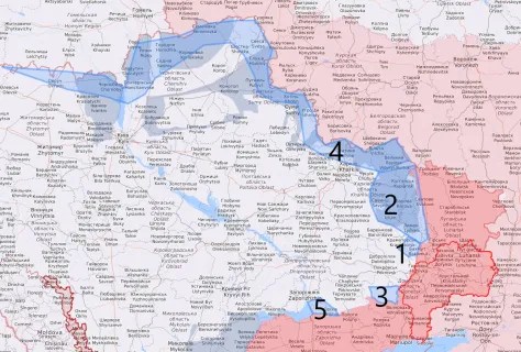 Soit simultanément au théâtre 4, soit après le déplacement sur Kiev (entourant ou prépositionnant au nord, à l’ouest et à l’est de Kiev), on peut voir s’ouvrir une cinquième ligne de front au sud. L’objectif serait d’atteindre la ville de Zaporozhye. Encore une fois, dans le but d’attirer au maximum les ressources et la logistique ukrainiennes.