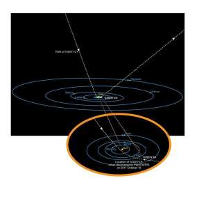 Animation de la trajectoire de l’objet A/2017 U1 récemment découvert. Comète ou astéroïde, il n’a jamais rencontré les 8 planètes de notre Système solaire. Cet objet est le premier identifié à venir d’un autre système planétaire.